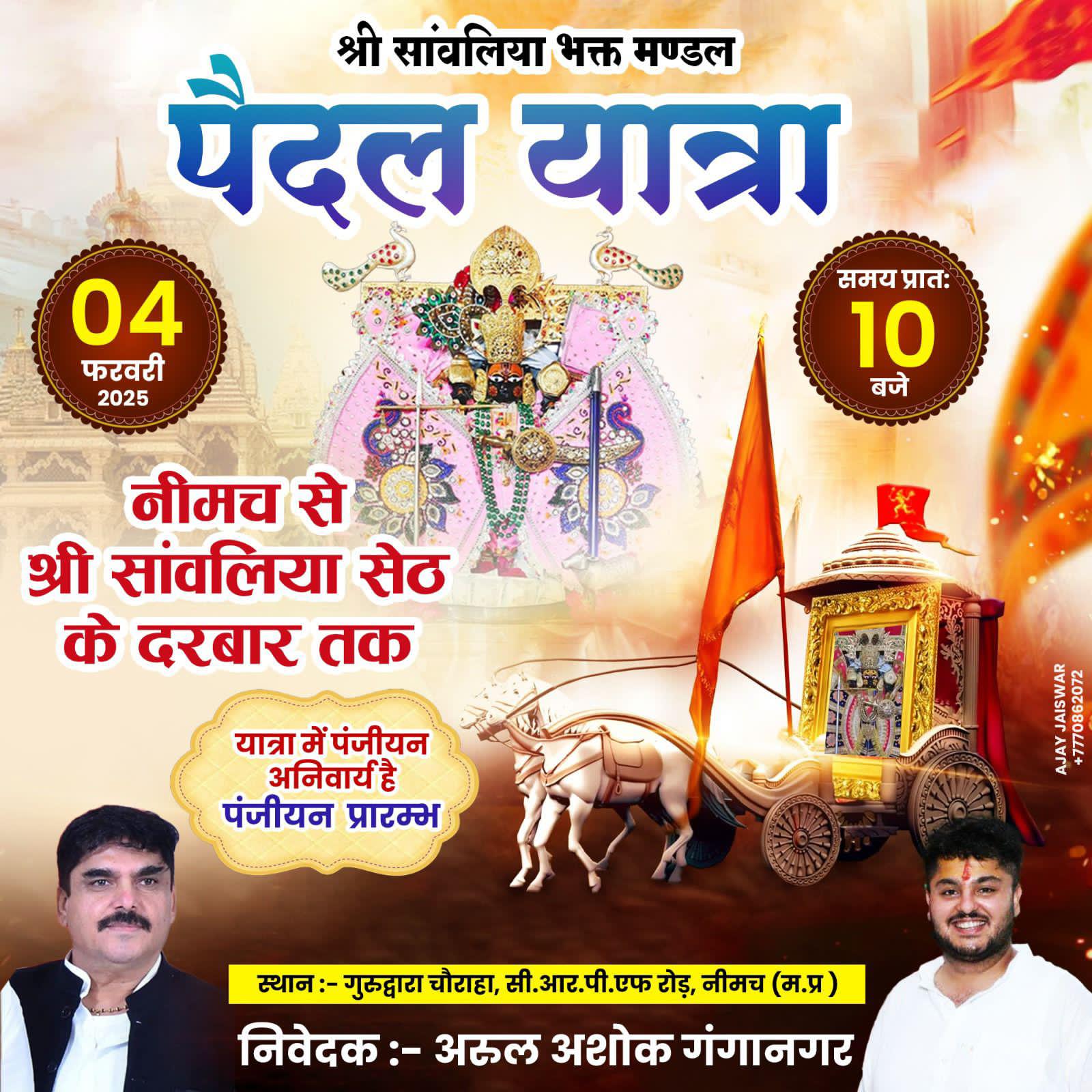 वरिष्ठ समाजसेवी अरुल अशोक अरोरा गंगानगर द्वारा यह पैदल यात्रा देश में खुशहाली, अमन चैन और जिले की सुख-समृद्धि की कामना को लेकर निकाली जाएगी। सेठो के सेठ सांवरिया सेठ प्रसिद्ध तीर्थ स्थल मंडफिया धाम में प्राकट्य भगवान श्री सांवलिया सेठ तक पैदल यात्रा में सुसज्जित रथ में भगवान सांवलिया सेठ की झांकी एवं डीजे ढोल नगाड़े शामिल होंगे। शोभायात्रा नगर के प्रमुख मार्गों से होती हुई, नयागांव , निंबाहेड़ा होते हुए 5 फरवरी को मंडफिया स्थित श्रीकृष्णधाम सांवलिया सेठ के दरबार में पहुंचेगी।