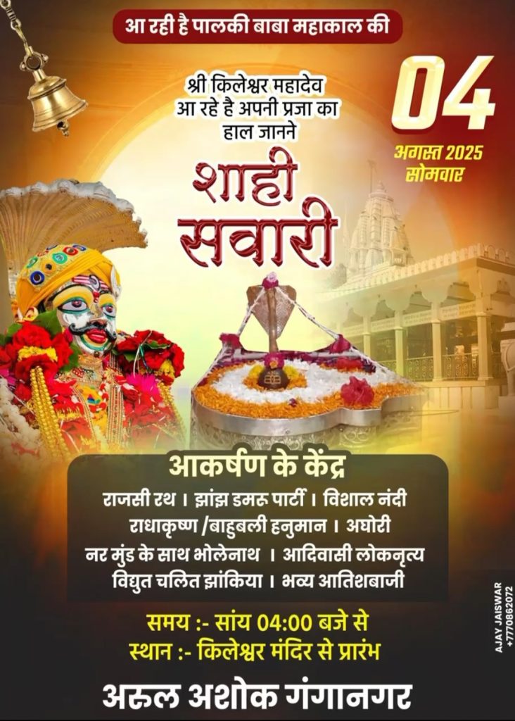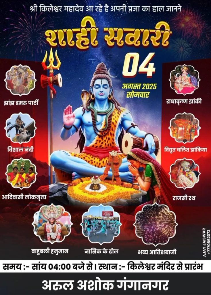 भगवान भोलेनाथ राजसी रथ में विराजित होंगे।झांझर, डमरू पार्टी, विशाल नंदी, राधाकृष्ण, बाहुबली हनुमान, अघोरी, नर मुंड के साथ भोलेनाथ, आदिवासी लोक नृत्य, विद्धुत चलित झांकिया और भव्य आतिशबाजी शाही सवारी में आकर्षण का केंद्र बनेंगे।